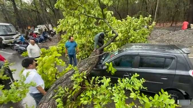 सात मोड़ के पास चलती कार के ऊपर गिरा भारी भरकम पेड़, खिड़की तोड़कर निकले बाहर